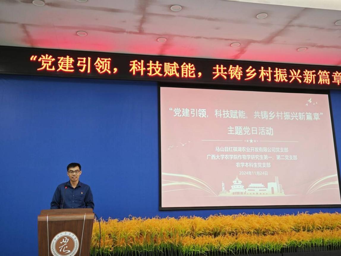 为深入贯彻党的二十届三中全会精神和中央一号文件精神关于创新驱动发展战略和农业农村现代化的重要部署,积极响应国家全面推进乡村振兴、加快农业强国建设的号召,11月24日上午,作物学研究生第二党支部积极利用与马山县红祺湖农业开发有限公司党支部共同签订结对共建协议的资源,联合作物学研究生第一党支部、农学本科生党支部邀请了马山县红祺湖农业开发有限公司党支部到我院开展“党建引领,科技赋能,共铸乡村振兴新篇章”主题党课。本次党课,我们荣幸邀请到了马山县红祺湖农业开发有限公司党支部书记甘昌军同志做主讲。