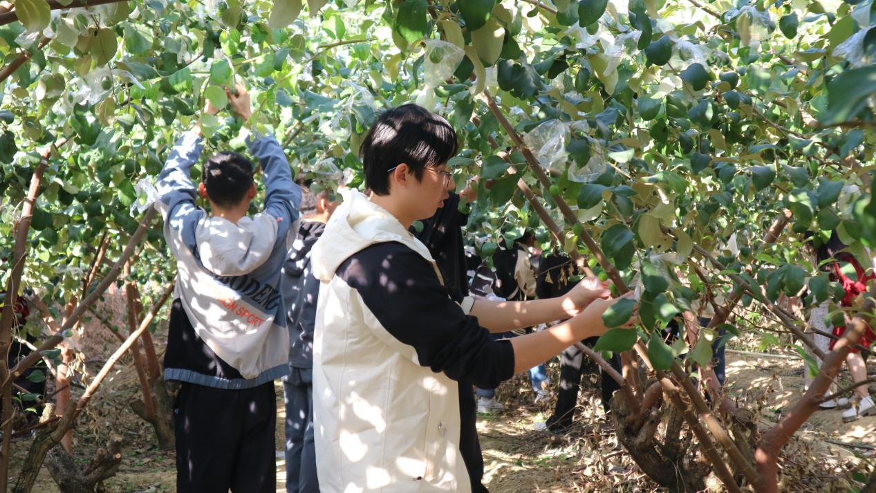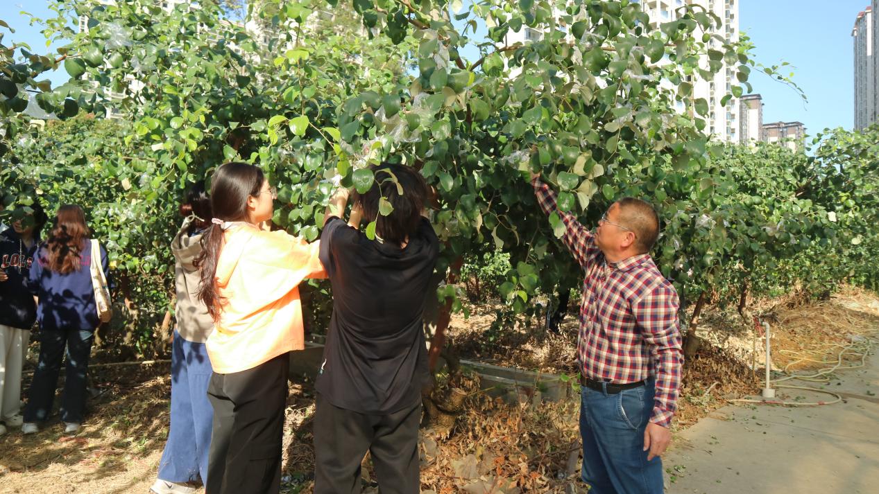 示范环节结束后,同学们来到标本园分组进行果树疏果和套袋实践,期间,同学们将所学理论知识付诸实践,并且相互交流心得,分享经验,形成良好的学习氛围。