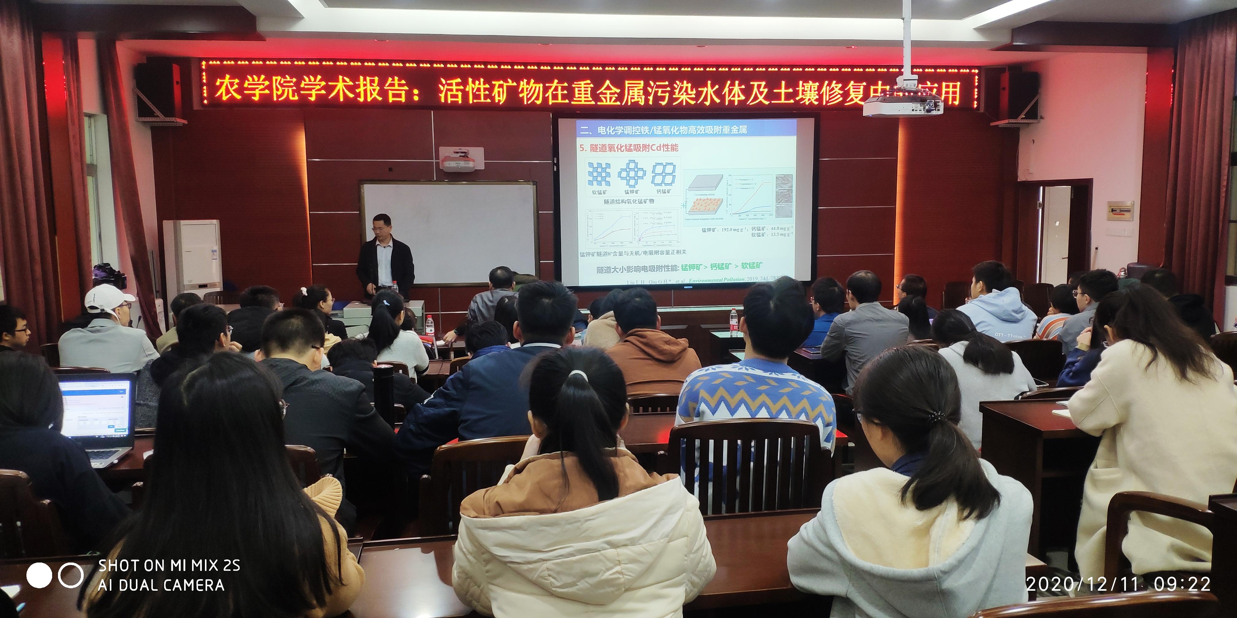 2020年12月11日上午,教育部新世纪优秀人才支持计划和中组部“万人计划”科技创新领军人才、华中农业大学邱国红教授应邀在农学院306报告厅作题为“活性矿物在重金属污染水体及土壤修复中的应用”的学术报告,报告会由王令强教授主持,学院副院长何新华教授代表学院欢迎邱老师的到访并做介绍,100多名师生聆听了报告。
