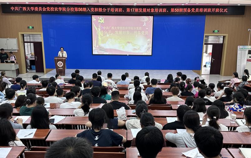 5月8日晚,我院在124报告厅举办广西大学党校农学院分校第56期入党积极分子培训班、第17期发展对象培训班、第58期预备党员培训班开班仪式。院党委书记袁涛、专职组织员、学生党支部书记、辅导员以及本次培训班全体学员参加开班仪式。学院团委书记李诺主持开班仪式。