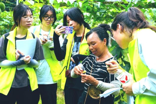调研中发现,今年当地的特色产业罗汉果因病虫害导致产量下降了不少。成员们仔细观察、认真记录,积极讨论解决方案。刘鹏站在五指毛桃种植试验田前说:“我在尝试五指毛桃与地胆草的套作种植模式,希望能为村民开辟新路,多一条‘致富路’”。成员们头顶烈日,汗湿衣衫,笔耕不辍,始终乘持精益求精的态度,怀揣着务实与奉献精神,将所学知识转化为解决难题的“金钥匙”,在泥土中耕耘成长。“干农民这行不容易,不过有你们来帮忙,效率提高了不少!”农户脸上洋溢着笑容,开心地说道。