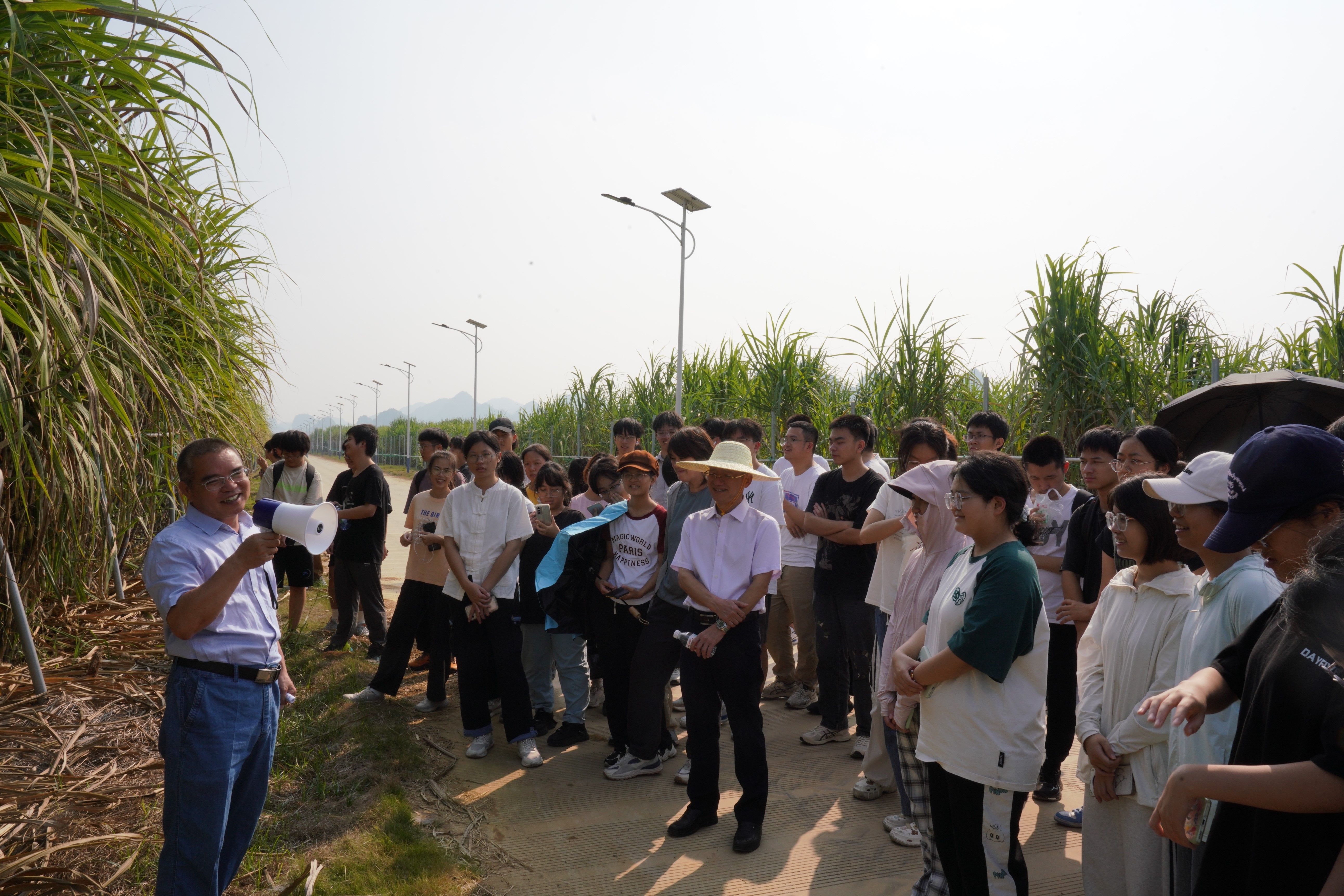 随后,在老师的带领下,同学们来到甘蔗和果树种植基地参观。韩世健老师从现代甘蔗的育种与栽培、农机农艺融合等方面向大家介绍了广西甘蔗产业的发展前景。罗聪老师带领大家走进芒果育种基地,为同学们介绍了各品种芒果的品种特性、嫁接技术和品种选育等知识。