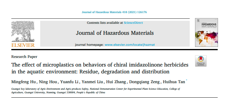 广西农业环境与农产品安全重点实验室/农学院农药残留与环境安全研究团队2021年5月在国际知名期刊Journal of Hazardous Materials上在线发表了题为“The effect of microplastics on behaviors of chiral imidazolinone herbicides in the aquatic environment: Residue, degradation and distribution”研究论文。微塑料是一类粒径小于5毫米的塑料碎片或颗粒,广泛存在于水体和陆地环境中。咪唑啉酮类除草剂因在环境中持久性长的特点,容易污染水体和土壤。近年来,微塑料与环境污染物相互作用的行为备受关注。然而,关于微塑料对该类除草剂的环境行为影响和机制还不清楚。在本研究中,通过建立水-沉积物微宇宙系统的方法在对映水平研究了聚乙烯微塑料对三种咪唑啉酮类除草剂在水生系统中环境行为的影响。结果表明,微塑料能够通过吸附和解吸附的方式显著影响该类除草剂在水生环境中迁移、降解和分配行为,明确了微塑料是影响咪唑啉酮类除草剂在水生环境中行为归趋的重要因素。研究结果为更加全面的评价咪唑啉酮类除草剂的环境风险提供了一定的科学依据。248cc永利集团博士研究生胡明锋为该论文的第一作者,谭辉华教授为通讯作者。该研究得到了国家自然科学基金项目支持。原文链接https://doi.org/10.1016/j.jhazmat.2021.126176