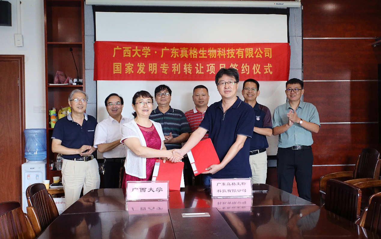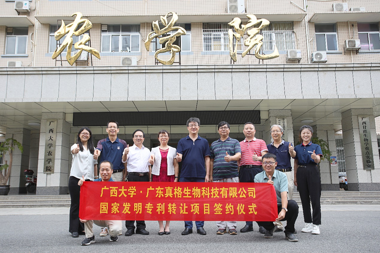 718日,我院吴海燕教授团队与广东真格生物公司完成科技成果转让签约仪式,真格生物王泊理总经理、陈晓辉副总经理、宋爱婷主任一行到农学院参加专利转让签约仪式,农学院何新华副院长主持会议,校科技处黄大安主任、农学院张国宏书记、何龙飞常务副院长、吴海燕副院长、周勋波教授、杨姗姗博士、张晓晓博士参加会议。广东真格生物公司是一家从事农药研发、销售为一体的高新技术企业,真格生物与我校农学院吴海燕教授团队就国家发明专利转让达成协议,转让金额100万元,合作双方顺利完成合同签约,这是农学院目前为止额度最高的单项科技成果转化。吴海燕教授团队长期从事作物线虫病害绿色防控研究工作,本次转让专利是其团队多年来潜心研究的硕果,专利所涉及的生物防治菌株对植物寄生线虫具有显著的防控效果,得到了真格生物的高度认可,期望将该专利落地形成新型绿色高效防控作物线虫病害产品,推广至田间地头,惠及千万家农户,助力乡村振兴。座谈会上,双方还就产学研深度合作进行了深入交流。