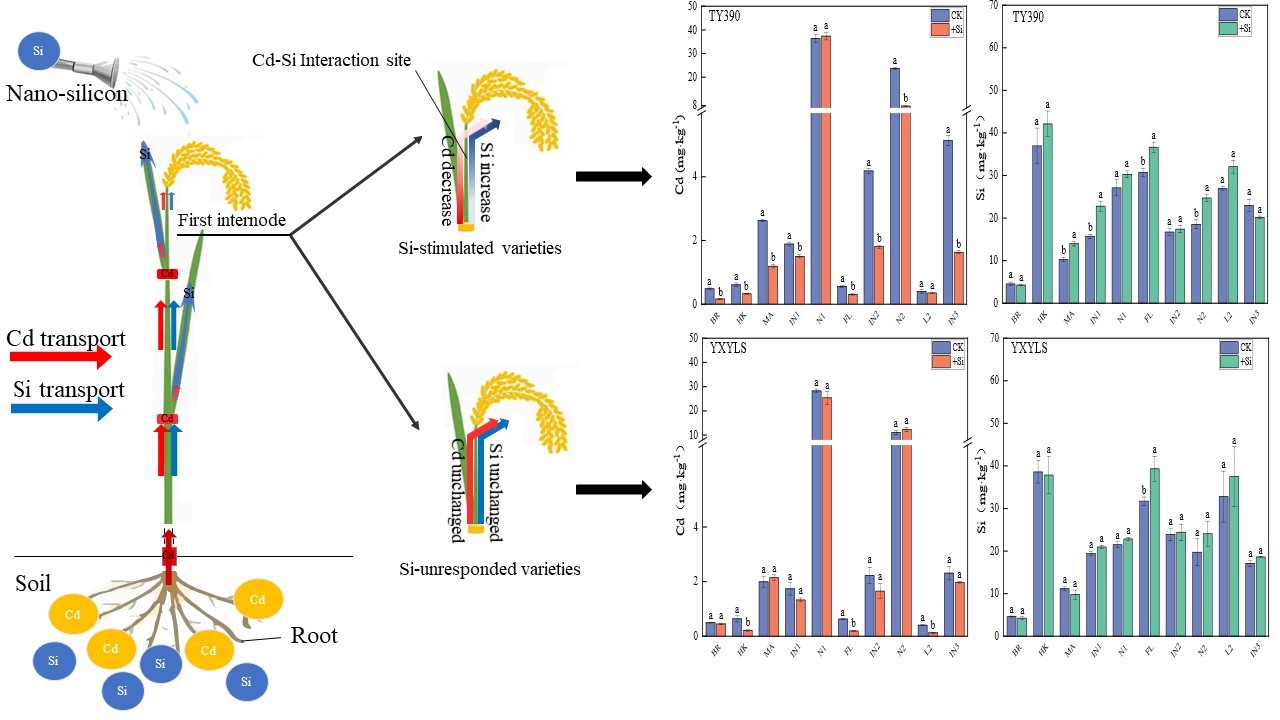 Cd是毒性最大的重金属之一,而稻米是人类摄入Cd的重要来源。目前通过叶面喷Si降低稻米Cd含量,已成为中国Cd污染稻田安全利用的主要措施技术之一。何冰团队通过大田实验研究了叶面施Si后4个水稻品种Si和Cd的运输和积累规律,发现第一节间是施硅抑制型水稻Si和Cd互作的关键部位,其中OsZIP7是水稻对Si响应的关键Cd转运蛋白之一。研究结果揭示Si抑制水稻Cd向上运输的生理机制,为水稻的安全生产以及叶面阻控剂的推广应用提供重要的参考。相关结果于2023年6月在线发表于环境科学类期刊《Journal of Hazardous Materials》。广西“农业环境与农产品安全”重点实验室、农学院为第一署名单位。