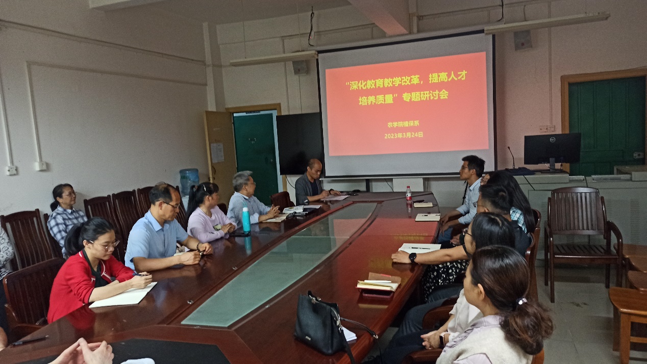 2023年3月24日,我院植物保护系在学院152召开“深化教育教学改革,提高人才培养质量”专题研讨会。本次会议由植物保护系副主任郑德洪副教授主持,植物保护学科带头人陈保善教授、植物保护系主任谭辉华教授、以及植物保护系全体教师参加会议。